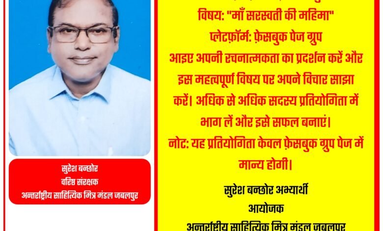 मैं सुरेश बन्छोर, अभ्यार्थी, वरिष्ठ संरक्षक/विषय प्रदाता अंतरराष्ट्रीय साहित्यिक मित्र मंडल, जबलपुर की ओर से आपको सूचित करता हूं कि हमारा साप्ताहिक साहित्यिक प्रतियोगिता का आयोजन किया जा रहा है। इस प्रतियोगिता में भाग लेने के लिए आपको अपनी रचनाएँ फेसबुक ग्रुप या पेज में पोस्ट करनी होंगी।