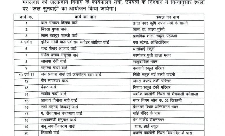 किया जाएगा। वही वार्ड 16 से 30 तक शिविर का आयोजन प्रातः 11:00 से दोप. 1:00 बजे तक और वार्ड 31 से 45 तक के वार्ड हेतु दोपहर 02:00 बजे से शाम 04:00 बजे तक जल सुनवाई शिविर आयोजित किया जाएगा।