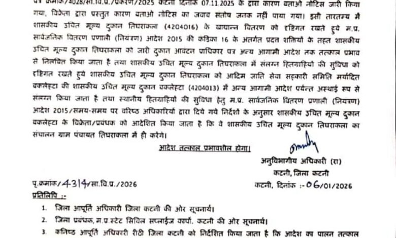 आदिम जाति सेवा सहकारी समिति मर्यादित बकलेहटा द्वारा संचालित शासकीय उचित मूल्य दुकान तिघराकला (4204016) के विक्रेता अनिरुद्ध सिह के द्वारा म.प्र. सार्वजनिक वितरण प्रणाली (नियंत्रण) आदेश, 2015 की कंडिका 10 (3), 11 (1), 11 (2), 11 (3), 11 (8), 11 (10) एवं 13(2) के उल्लंघन पर एसडीएम कटनी द्वारा अनिरुद्ध सिंह को 7 नवंबर 2025 को कारण बताओ नोटिस जारी किया गया था। परंतु, विक्रेता द्वारा प्रस्तुत कारण बताओ नोटिस का जवाब संतोषजनक नहीं पाया गया।